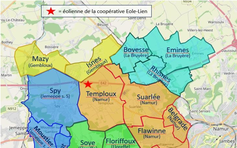 La coopérative Eole-Lien est à l’origine du projet d’éolienne citoyenne à Temploux (qui est en activité depuis mars 2021). Cette coopérative citoyenne a pu voir le jour grâce aux 600 coopérateurs qui ont rassemblé 850.000 € de capital et ont eu recours à diverses sources de financement complémentaires.